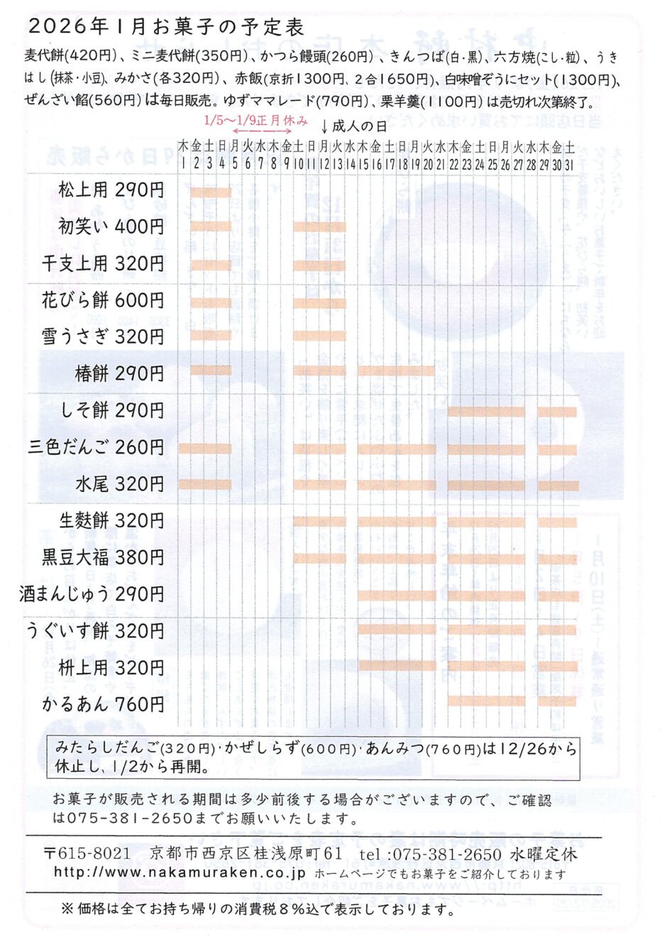 現在販売しているお菓子は「本店和菓子予定表」をご覧下さい。